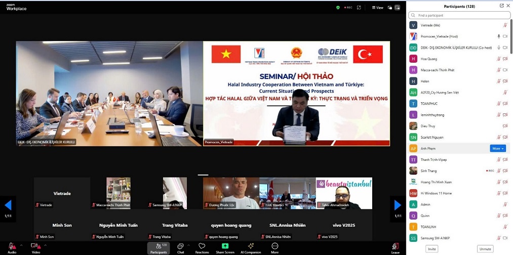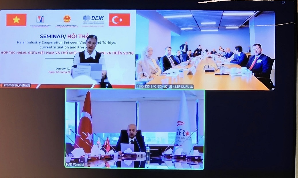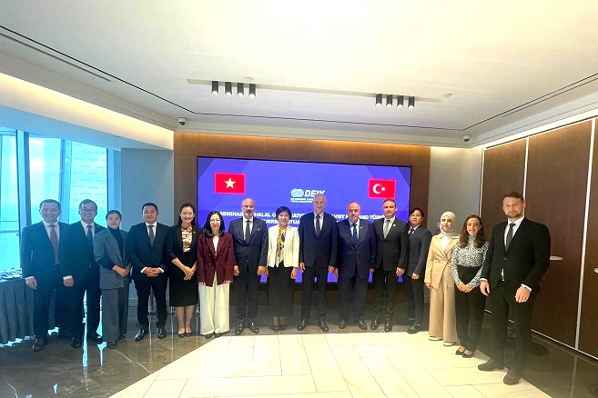Ngày 03/10/2025 tại Istanbul, Đại sứ quán Việt Nam tại Thổ Nhĩ Kỳ phối hợp với Cục Xúc tiến thương mại (Bộ Công Thương) và Ủy ban Kinh tế đối ngoại Thổ Nhĩ Kỳ (DEIK) tổ chức Hội thảo “Hợp tác Halal Việt Nam – Thổ Nhĩ Kỳ: Thực trạng và triển vọng”. Hội thảo được tổ chức theo hình thức trực tiếp kết hợp trực tuyến, với sự tham dự của bà Đặng Thị Thu Hà, Đại sứ Việt Nam tại Thổ Nhĩ Kỳ; ông Lê Hoàng Tài, Phó Cục trưởng Cục Xúc tiến thương mại (Bộ Công Thương); ông Reha Denemec, Chủ tịch Hội đồng Kinh doanh Thổ Nhĩ Kỳ - Việt Nam, Thành viên Ban Chủ tịch DEIK; ông Yunus Ete Chủ tịch Hội đồng Thượng đỉnh Halal Thế giới; ông İhsan Övüt, Tổng Thư ký Viện Tiêu chuẩn và Đo lường các Quốc gia Hồi giáo (SMIIC); ông Zafer Soylu, Chủ tịch Hội đồng Cơ quan Chứng nhận Halal Thổ Nhĩ Kỳ (HAK); ông Ramlan Osman,Giám đốc Trung tâm Chứng nhận Halal Quốc gia (HALCERT) - Bộ Khoa học và Công nghệ Việt Nam và gần 200 doanh nghiệp của Việt Nam và Thổ Nhĩ Kỳ tham dự trực tuyến.